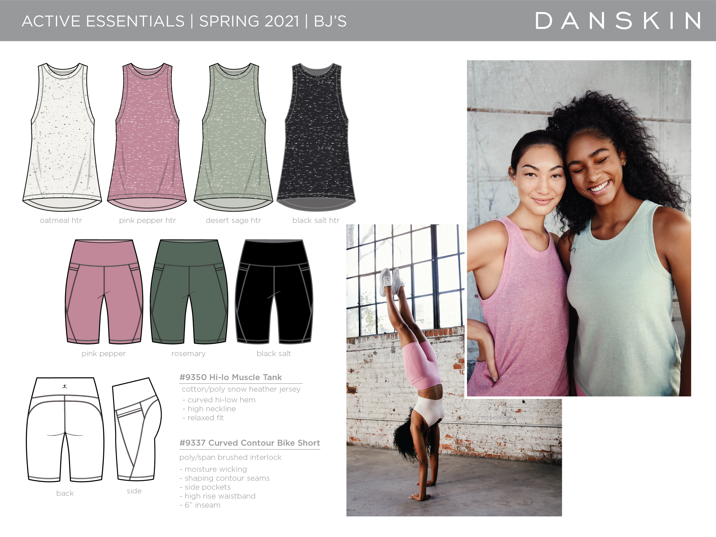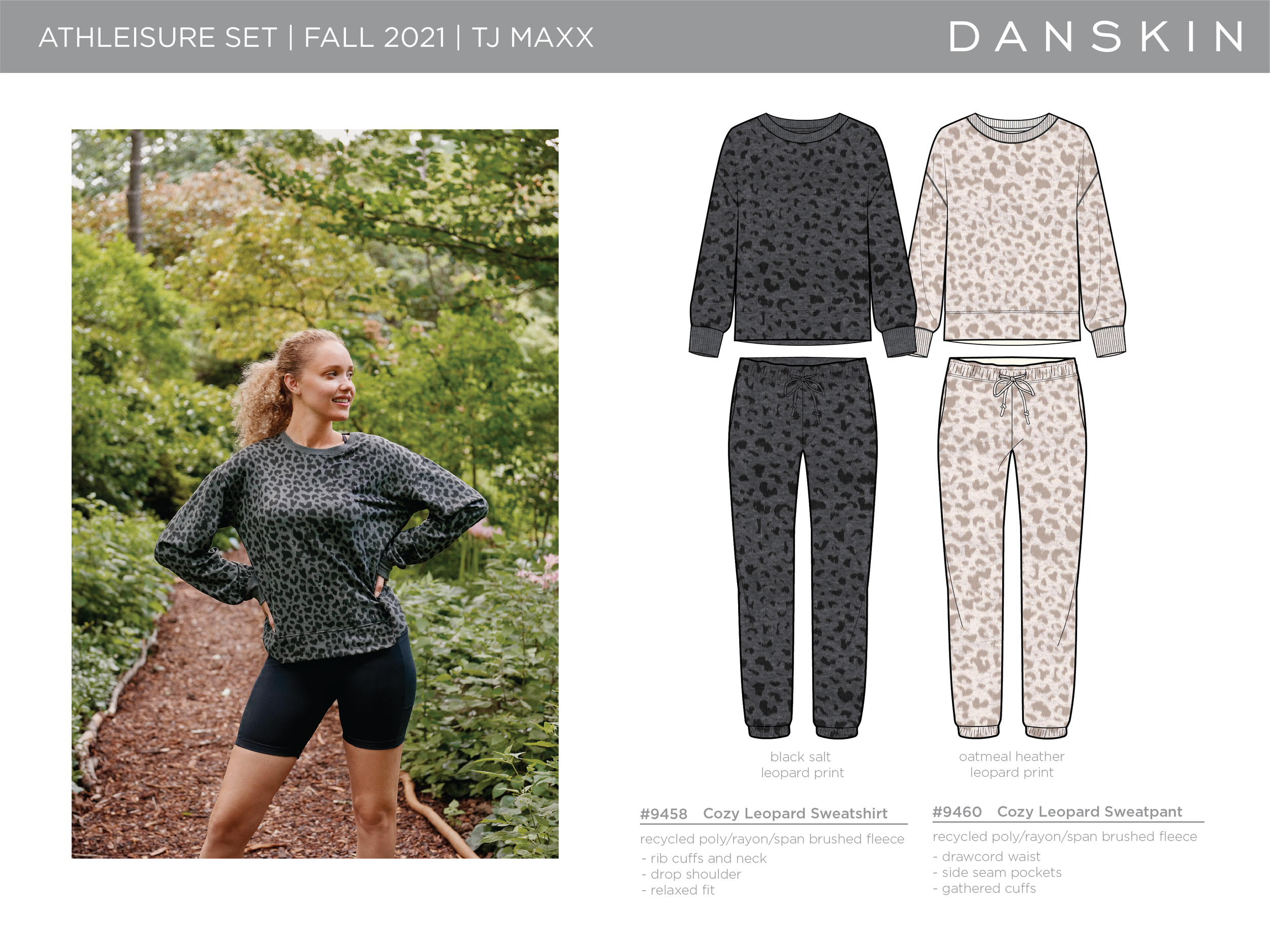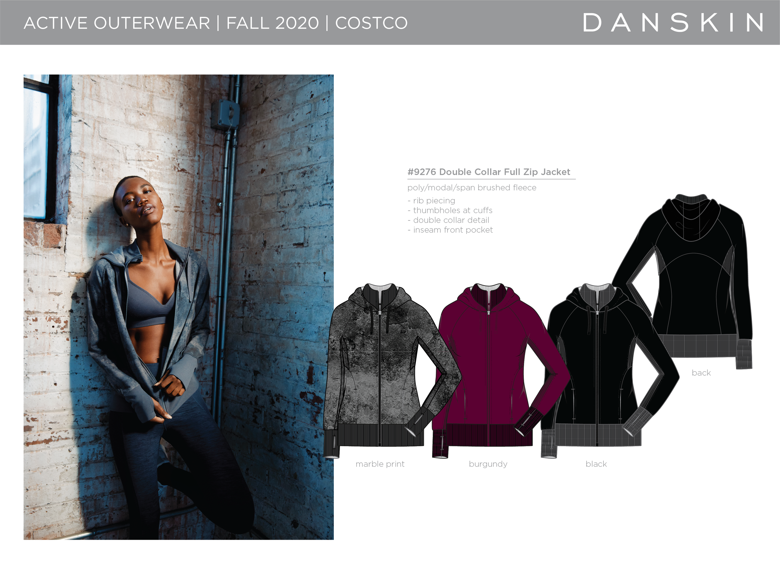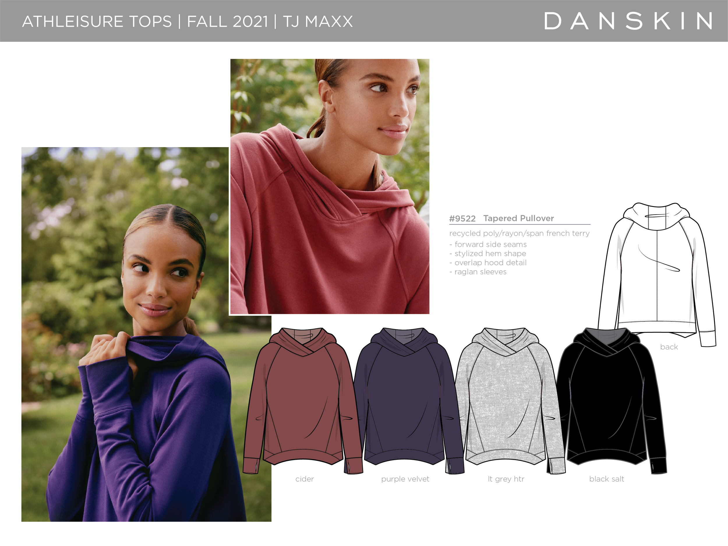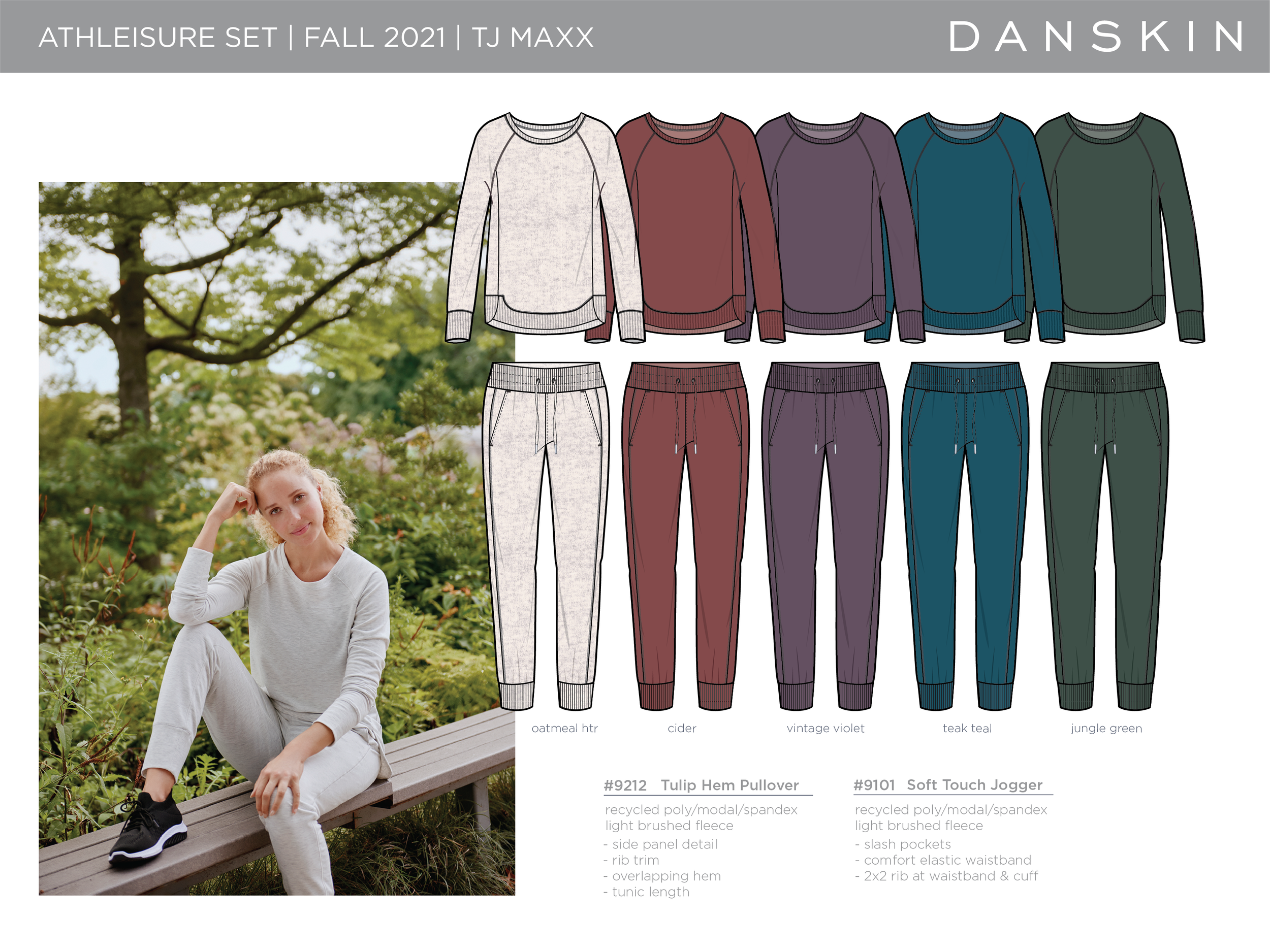 As an Apparel designer for Danskin, I designed activewear ranging from performance wear such as leggings, sports bras, and running shorts, to lounge pieces such as sweatpants, hoodies, and jackets. Danskin Activewear is sold at retailers such as Costco, Nordstrom Rack, TJ Maxx, BJ's and Marshalls. The Danskin Activewear division brings the comfort and reliability of the brand's dancewear heritage to the everyday. Each seasonal development starts with trend research, market analysis, thematic concept, and color direction and then progresses to fabric sourcing, garment fittings, sampling, and sales catalog presentation.